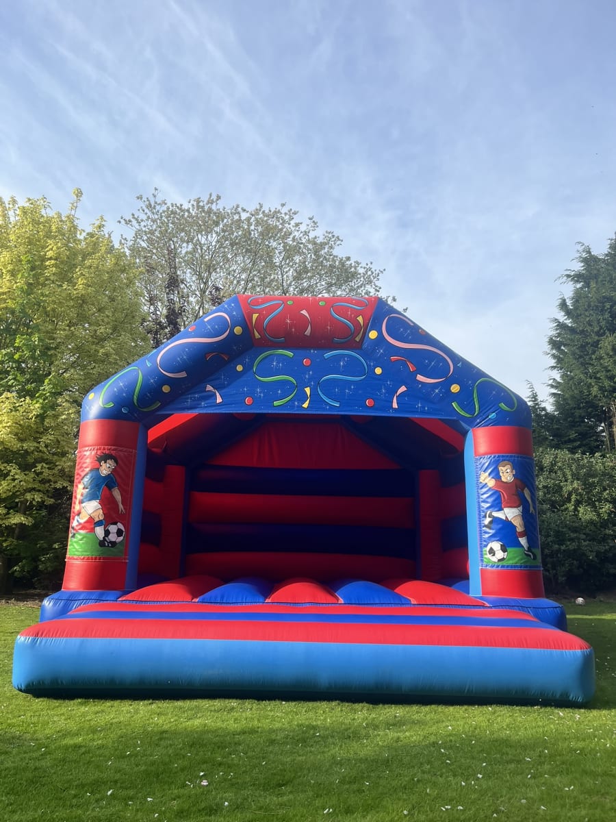 Secure the Bouncy Castle Hire 17ft X 16ft Party A Frame Football Theme (Disco Ready) in Long Sutton, Sutton Bridge, Holbeach, Spalding, Pinchbeck, Bourne, Kirton, Boston, Wisbech, Kings Lynn, Downham Market, March, Peterborough, Sandringham, Hunstanton, and surrounding areas for your next event and let the fun begin! Our team delivers, sets up, and collects the bouncy castle, ensuring a hassle-free experience from start to finish.