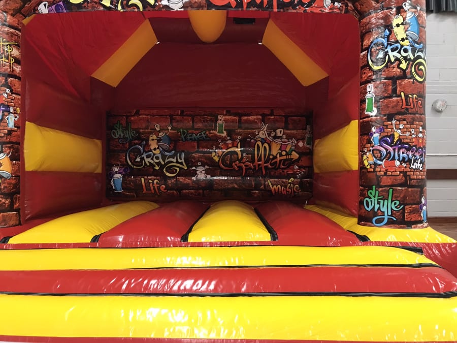We offer Bouncy Castle Hire 12ft x 12ft Yellow & Red A Frame Graffiti Theme in Long Sutton, Sutton Bridge, Holbeach, Spalding, Pinchbeck, Bourne, Kirton, Boston, Wisbech, Kings Lynn, Downham Market, March, Peterborough, Sandringham, Hunstanton, and Surrounding Areas — bringing reliable setups, friendly staff and on-time delivery right to your door 🚚✨.