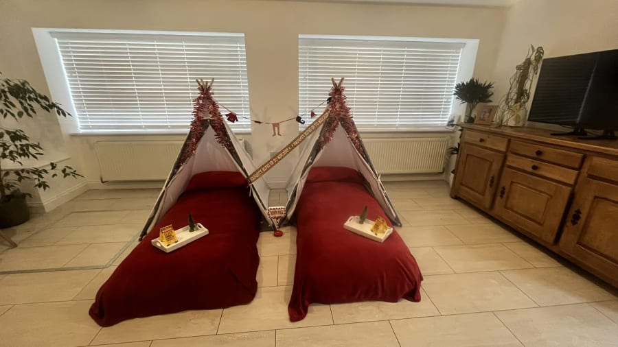 Our Elf-themed teepee celebrates all things Naughty & Mischief with charming decorations that spark imaginative play. The From 2 - 6 Person Setup includes the teepee, mattress, comfy bedding, and theme-related accessories as shown in the picture — think cosy throws, cushions, soft fairy lights (battery-powered). It’s ideal for festive sleepovers and birthday parties. 👧🧒